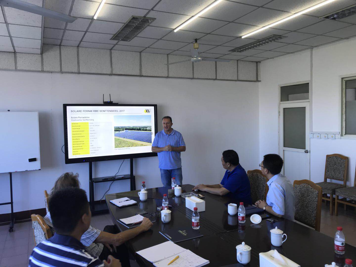 Klaus Taafel(克勞斯·塔佛爾)先生等一行先后到我公司產(chǎn)品展廳、“太陽能+”多能互補(bǔ)項(xiàng)目現(xiàn)場(chǎng)進(jìn)行了實(shí)地參觀考察。考察期間,公司總經(jīng)理劉波先生向其詳細(xì)介紹了工業(yè)園區(qū)“太陽能+”多能互補(bǔ)應(yīng)用項(xiàng)目的實(shí)施、運(yùn)行等內(nèi)容,Klaus Taafel(克勞斯·塔佛爾)先生通過聽取劉波先生的講解及現(xiàn)場(chǎng)參觀考察,對(duì)“太陽能+”多能互補(bǔ)應(yīng)用產(chǎn)生濃厚興趣,尤其是對(duì)“太陽能+”多能互補(bǔ)應(yīng)用的技術(shù)、運(yùn)行、實(shí)施推廣等方面技術(shù)及方法進(jìn)行了交流與探討。